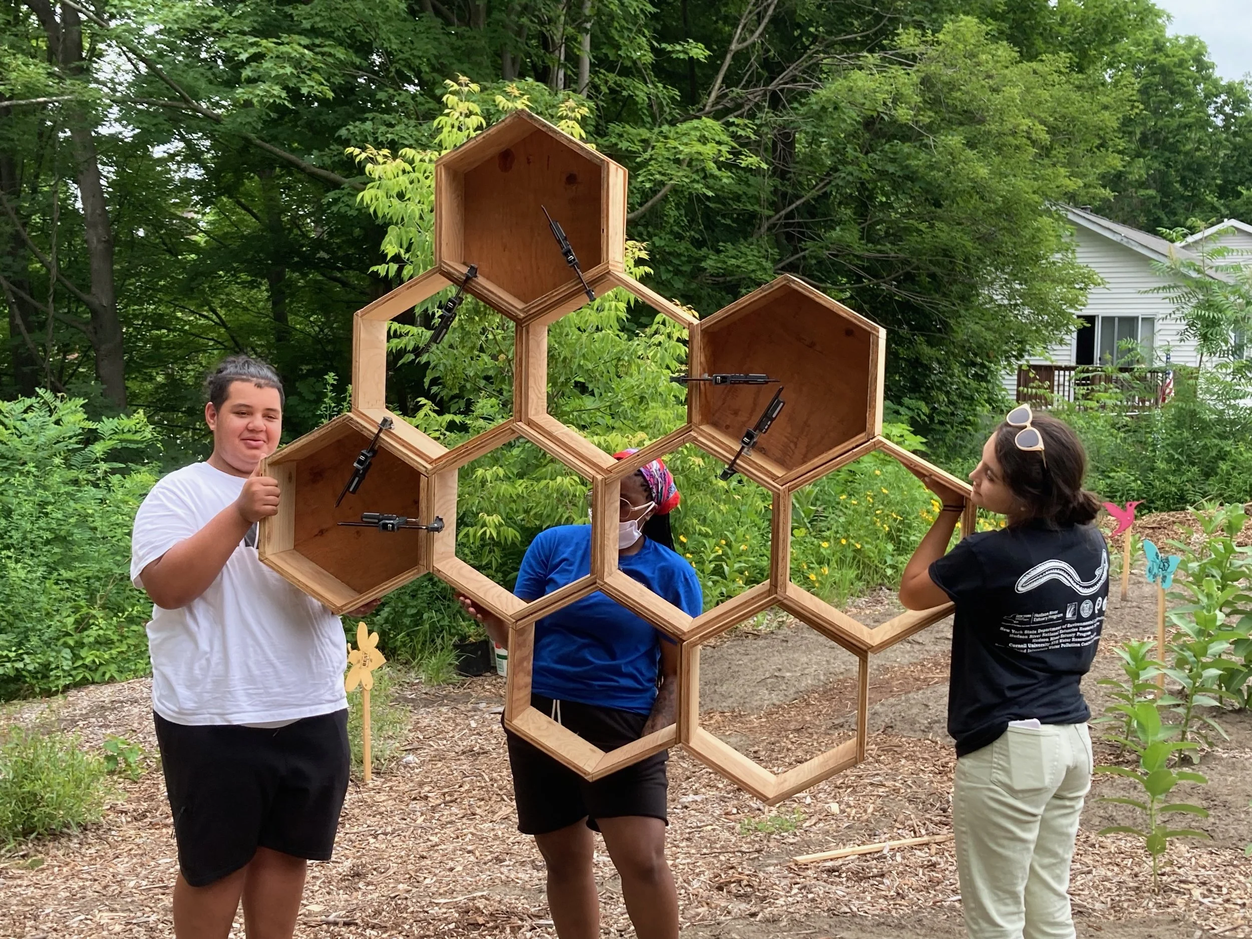 We began the multi-year design process by collaborating with Kingston YMCA Farm Project teens. We mentored the teens in creating a biodiverse native landscape and pollinator habitat, using hands-on art activities to educate, empower, and inspire. Following our series of community-engaged design and pollinator education workshops, the teen design team established the core principles for the Pollinator Sanctuary: Curiosity, Fun, Diversity, and Education. Their intention was to create a haven for pollinators and a beautiful place for visitors to meander, explore, and discover.