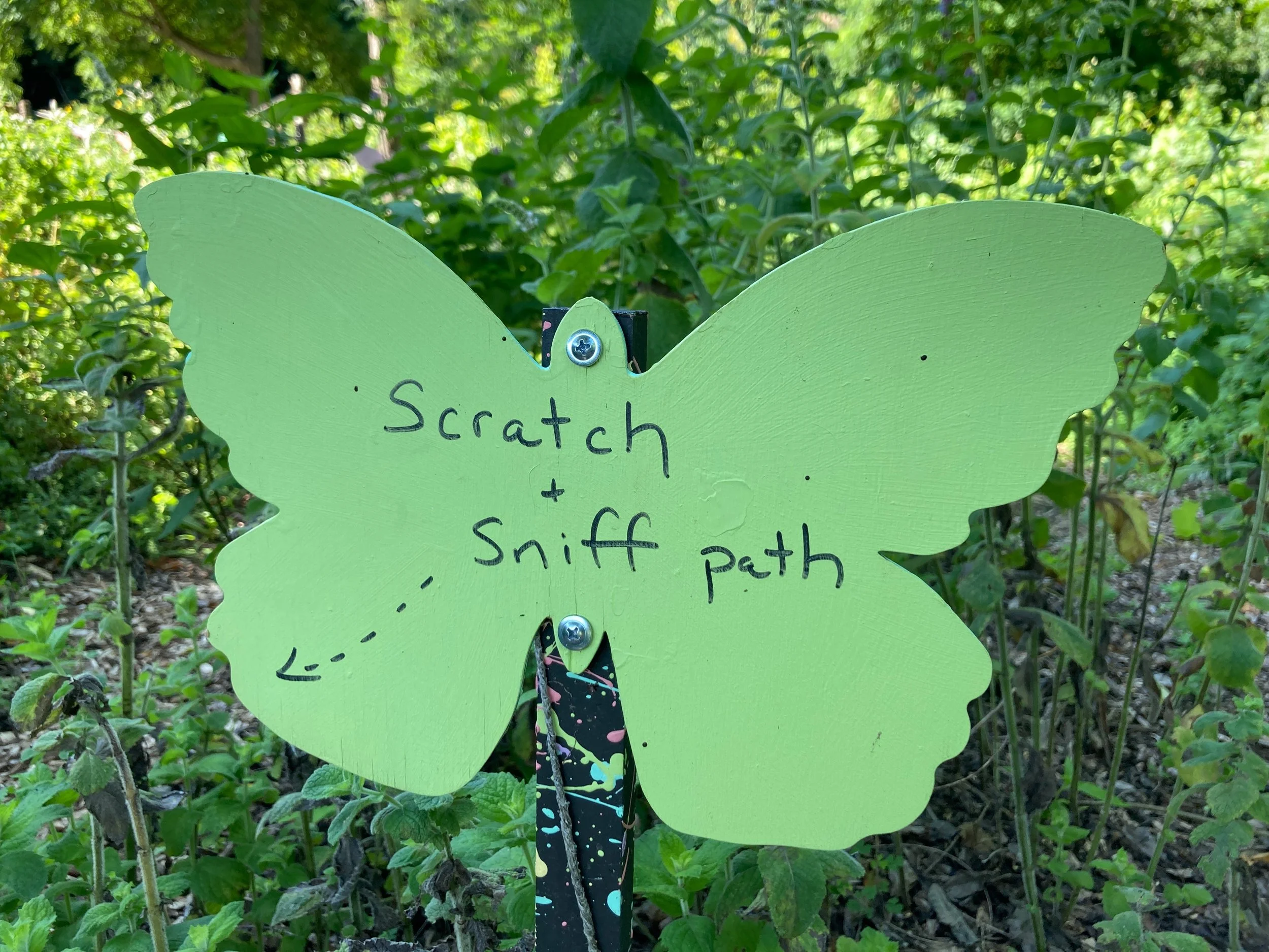 A 'Scratch and Sniff' path offers an aromatic exploration featuring sage, fennel, marigold, apple mint, thyme, basil, lavender, lemon, and bee balm. The design team chose a weeping Eastern Redbud tree to welcome visitors with its heart-shaped leaves and to invite children to play under its branches.