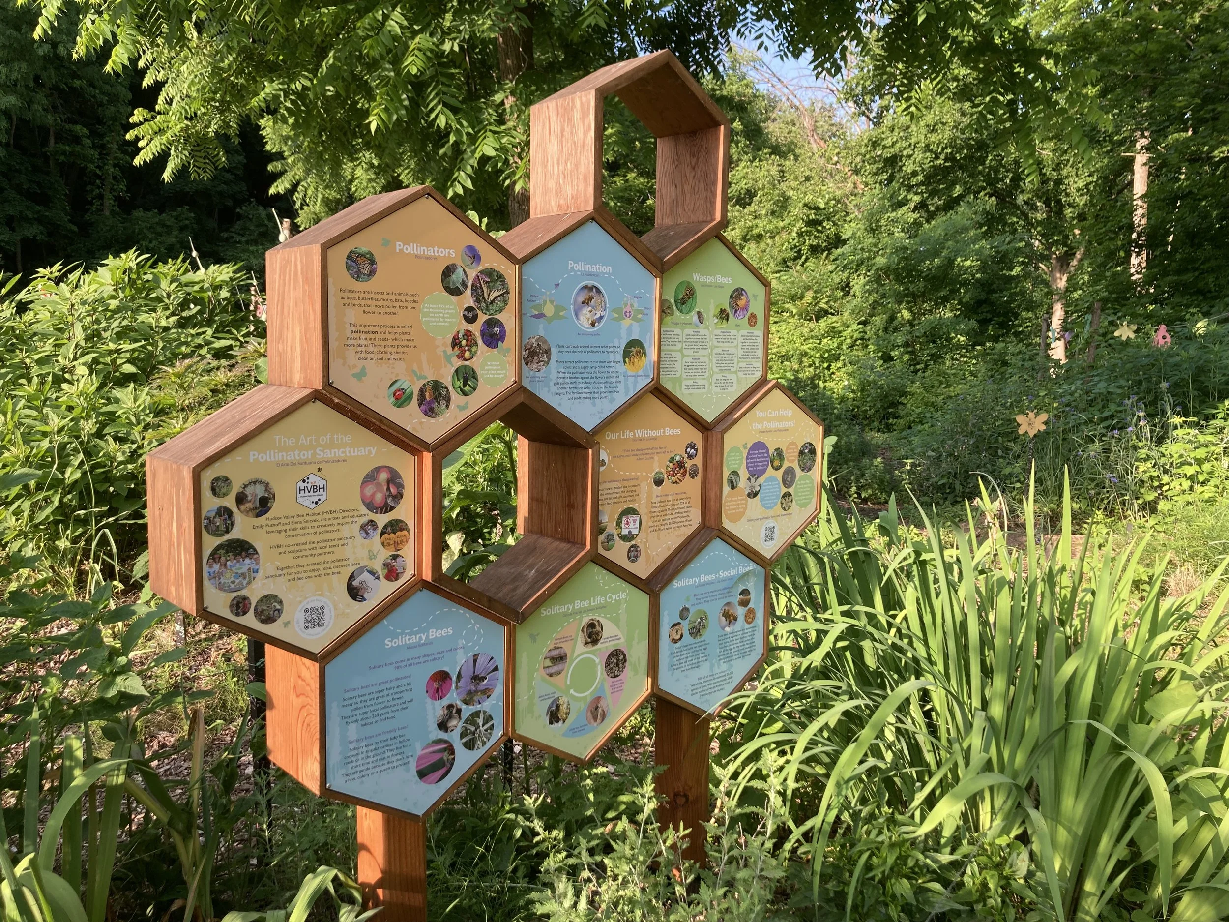 Centrally located in the sanctuary is a bee habitat sculpture composed of eleven cedar wood hexagons. These hexagons house solitary bee nesting materials, providing a safe and healthy way for solitary bees to nurture their young and offering humans an accessible means to observe these important pollinators. Decorative grills on the front of the sculpture, featuring organic and beautiful patterns, attract native bees and humans alike and protect the baby bees from predators.