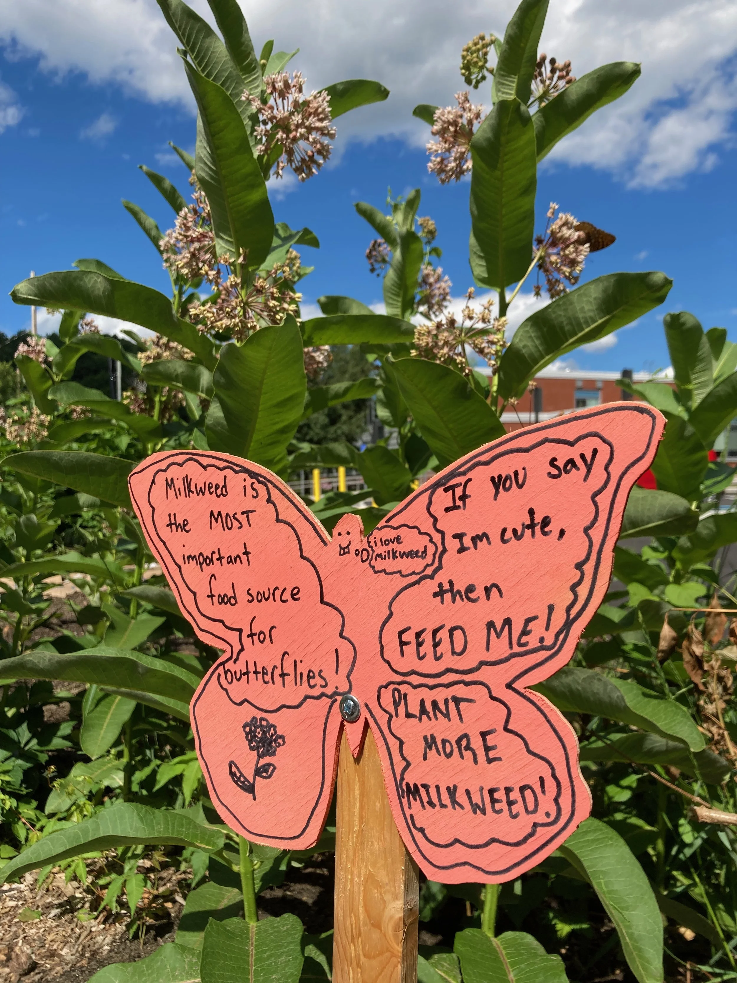 The garden design features leaf-like paths that offer a more organic experience than the asphalt parking lot next to the sanctuary. Each path branch includes zones for sensory observation, meditation, foraging, and learning. The design team incorporated the existing milkweed on-site into their design and created the "Bee One with the Bees" zone under the shade of a walnut tree.